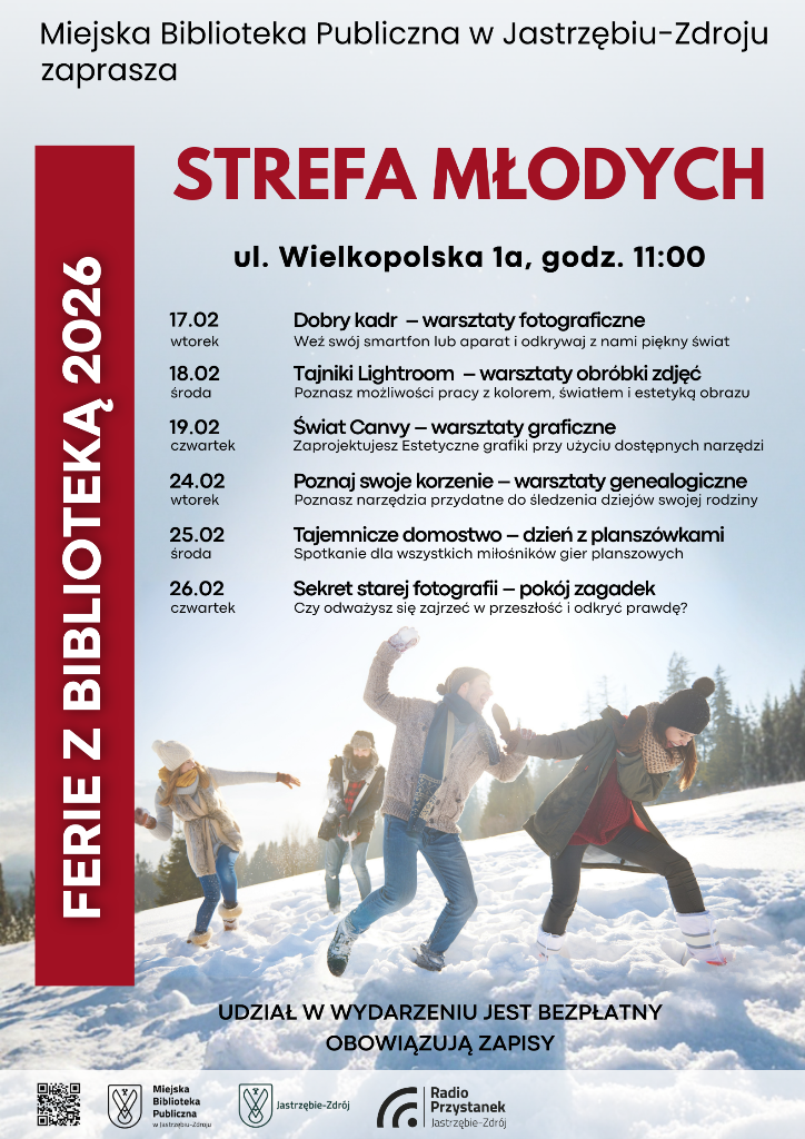 Strefa Młodych zaprasza na zimowe spotkania pełne kreatywności, odkrywania i dobrej zabawy. Czeka na Ciebie tydzień pełen warsztatów, gier i zagadek – każdy znajdzie coś dla siebie.