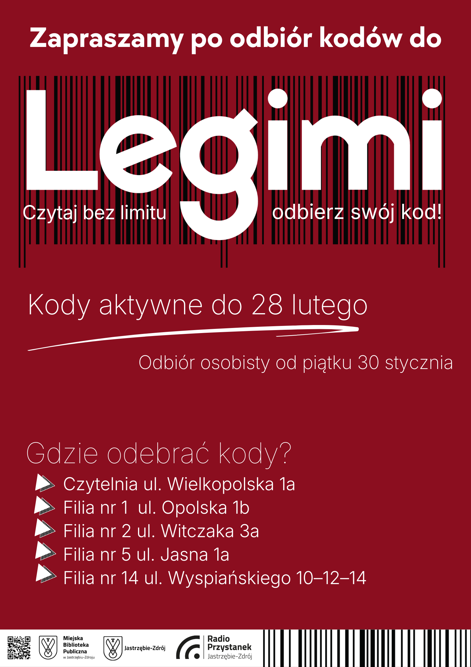 Nowe kody do Legimi, ważne do 28 lutego 2026 r., będzie można odebrać osobiście od piątku, 30 stycznia 2026 r., w: