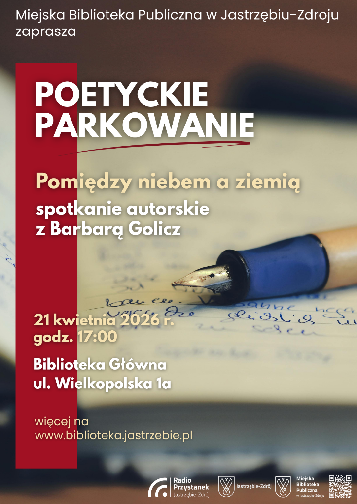 Zapraszamy na poetycki spotkanie w ramach cyklu „Poetyckie Parkowanie”. Gościem kwietniowego spotkania będzie Barbara Golicz – żorzanka, członkini Koła Poetów „Wena”, autorka tomiku poezji „Pomiędzy niebem a ziemią”.